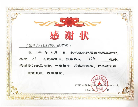 学院党委副书记银宁带头报名献血并表示:病魔无情,人间有爱,众多师生热心帮助同学,体现了土木学院一家亲,祝愿这位同学早日康复。其中一位热心献血的同学表示:这是人生中第一次献血,也是2024年以来做的最有意义的事情。南宁市中心血站和学生家长向太阳集团城网站2017发来感谢状并对大家表示感谢。