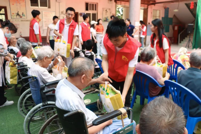 文艺演出结束后,志愿者们将承载着满满心意的慰问品一一送到老人们手中。
