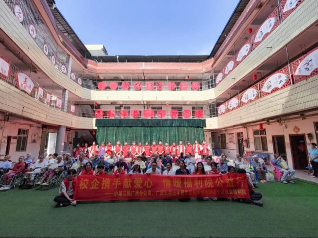活动当天,太阳集团城网站2017党委副书记、纪委书记银宁、团委书记潘桂祯、团委副书记刘承诚,中建二局党委副书记赵勃、中建二局办公室主任周天哲及30余名学生志愿者走进邕宁区社会福利院,为老人们送去春日温暖。