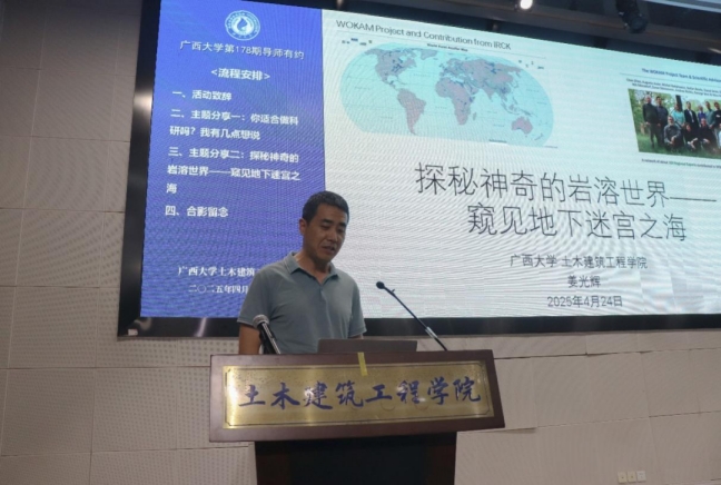 姜光辉老师结合自身经验,详细讲解了中国南方岩溶研究的研究进展。他从岩溶空间分布情况、区域地质特性,岩溶泉的类型等方面切入,细致解读了南方岩溶的独特机制,并创新性地提出“地下海”概念,从多个维度对其进行了全面剖析。姜老师特别指出,“地下海”与人类生产生活紧密相连,尽管其变化动态强、认知程度低,但持续深入研究岩溶对人类至关重要。