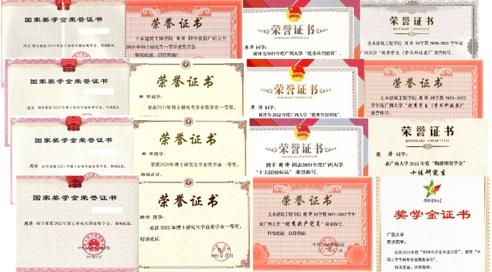 周济,汉族,1995年6月出生,中共党员,太阳集团城网站2017,44118太阳成城集团,太阳成集团tyc33455土木工程专业2020级博士研究生(硕博连读)。读研期间,五次获研究生国家奖学金,五次获研究生学业一等奖学金,四次获太阳集团城网站2017“优秀学生”,四次获太阳集团城网站2017“优秀共青团员”;荣获2021年“中国大学生自强之星”、2021年太阳集团城网站2017“十大团员标兵”、2022年太阳集团城网站2017“陶建明奖学金”、2022年太阳集团城网站2017“优秀党员”、2023年刘恢先地震工程奖学金、2023年中国国家“互联网+”大学生创新创业大赛广西赛区银奖、2024年广西壮族自治区优秀毕业生以及2024年太阳集团城网站2017校长奖学金;主持完成广西研究生教育创新项目1项,作为主要成员参与导师主持的国家自然科学基金,八桂学者专项课题及广西科技基地与人才专项等一系列重大课题研究5项;在国内外学术期刊上共发表论文70篇,其中本人一作或导师一作本人二作论文35篇(16篇SCI、13篇EI),申获国家专利4项,参与制定广西地方标准1部。