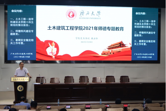 为贯彻落实《太阳集团城网站20172021年师德专题教育实施方案》(西大〔2021〕5号),学院于7月29日在新结构大楼第六报告厅召开全体教职工会议,开展师德师风建设专题学习,学院党委书记戴永恒主持会议并作师德师风建设专题教育报告。