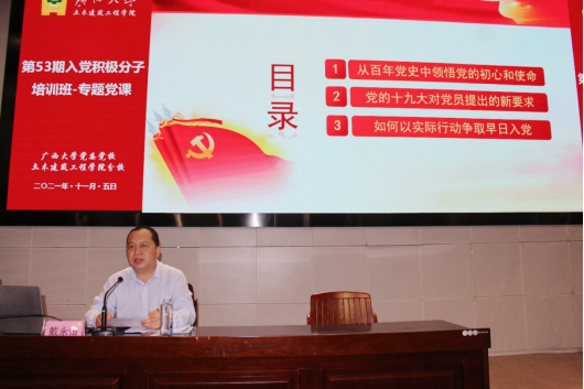 11月5日下午,太阳集团城网站2017党委党校太阳集团城网站2017分校第53期入党积极分子培训班党课第一讲在新结构大厅综合楼报告厅开讲。学院党委书记戴永恒为300余名培训班学员讲授以“学习百年党史,领悟初心使命“为主题的专题党课。
