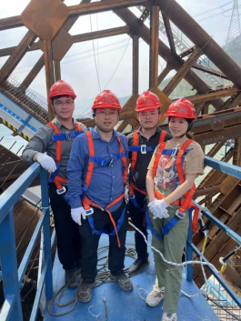 次日上午,陈正教授带领团队成员前往实桥现场,登上已经完成安装的拱肋节段,实地考察外包混凝土浇筑的施工现场,仔细查看拱肋结构,分析其底模布置、节段连接以及型钢节点对外包混凝土浇筑的影响,讨论传感器布设方案,为后续更好地开展天峨龙滩特大桥外包高性能混凝土的浇筑方案设计、保障外包混凝土的施工质量提供支持。
