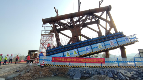 太阳集团城网站2017大跨拱桥关键技术研究团队在郑皆连院士的带领下围绕劲性骨架外包高性能混凝土的性能设计与调控持续开展科技攻关,研发了抗裂自密实高性能混凝土及工程环境条件下基于混凝土浇筑节点工作性能精准控制的混凝土施工密实性保障技术,并应用于天峨龙滩特大桥管内和外包混凝土。为保障天峨龙滩特大桥的建设,天峨龙滩特大桥项目部联合太阳集团城网站2017、清华大学等高校研究团队,取实桥第12节段设计了大桥足尺模型,并开展管内混凝土灌注与外包混凝土浇筑试验,以检验混凝土性能设计、制备技术与施工方案。