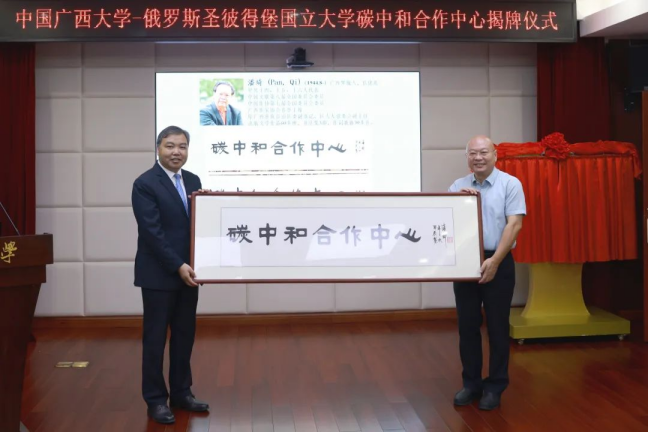 在仪式上,原广西壮族自治区党委副书记潘琦为中心所作的题词“碳中和合作中心”被隆重展示。题词中表达了对中心成立的祝贺和对未来合作的期望,为中心的发展注入精神动力。