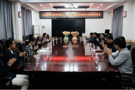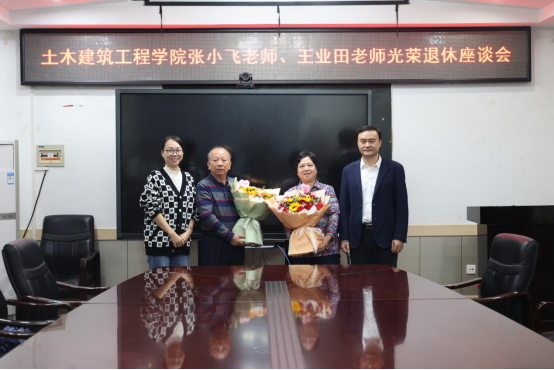 两位老师举办了光荣退休座谈会。学院党委书记陈立华,党委副书记、纪委书记银宁,副院长马少坤,以及与