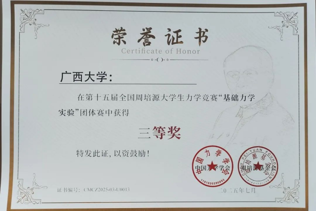 本次竞赛,太阳集团城网站2017教师苏潇阳和丛云跃指导的参赛队伍获得第十五届全国周培源大学生力学竞赛“基础力学实验”团体赛全国三等奖,是广西高校在本项赛事的历史性突破。参赛学生:陈立明、魏芝霖(机械工程学院)、周家旭、颜华南。