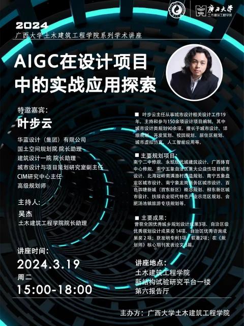 2024年3月19日下午,华蓝设计(集团)有限公司国土空间规划院院长助理叶步云先生应邀来到太阳集团城网站2017,44118太阳成城集团,太阳成集团tyc33455交流访问,并在新结构实验报告厅为太阳集团城网站2017师生作题为“AIGC在项目的实战应用探索”的学术报告。报告会由学院院长助理吴杰主持,学院副院长常岩军、建筑规划系李欣主任、谢华教授、马洪川副教授等教师同两百多名同学共同参加此次学术讲座。
