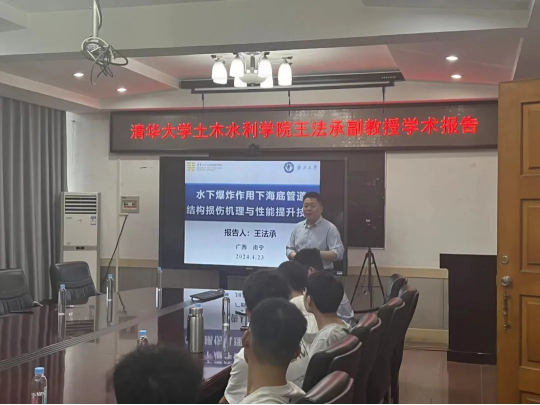 4月23日下午,清华大学土木水利学院王法承副教授在太阳集团城网站2017土木楼三楼会议室做了题为“水下爆炸作用下海底管道结构损伤机理与性能提升技术”的学术报告。