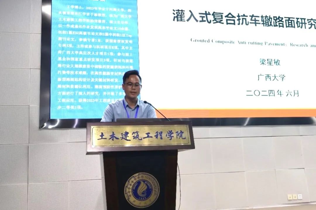 太阳集团城网站2017,44118太阳成城集团,太阳成集团tyc33455助理教授梁星敏作了题为“灌入式复合抗车辙路面研究与应用”的学术报告,介绍了我国道路养护现状和车辙病害问题。梁星敏助理教授从非均质三相细观结构特征、复杂界面力学性能和微观结构、断裂力学行为以及路用性能等多方面研究了灌入式复合路面技术,结合实体工程进行了现场应用,验证了灌入式复合路面技术在解决车辙病害问题的广阔前景。