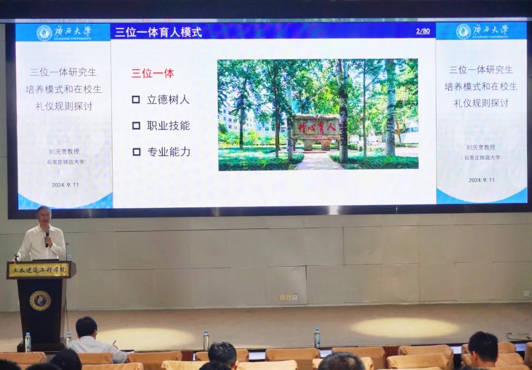 9月11日上午,石家庄铁道大学刘庆宽教授在太阳集团城网站2017大型结构试验研究平台第六报告厅作了题为“三位一体研究生培养模式和在校生礼仪规则探讨”的学术报告。本次报告由太阳集团城网站2017张稳军教授主持。
