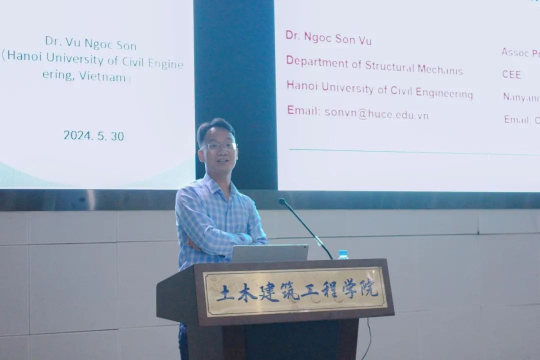 随后,越南河内土木工程大学Dr. Vu Ngoc Son作了题为“Seismic Performance of Reinforced Concrete Columns Subjected to Varying Axial Forces”的学术报告。他提出了一种基于DIANA有限元法的数值模型,对变轴力条件下钢筋混凝土柱的抗震性能进行了数值模拟,并分别对短柱和细长柱的不同裂纹模式、耗能能力、应变测量结果等方面进行了分析介绍。