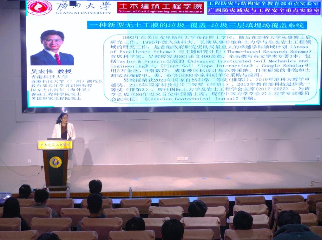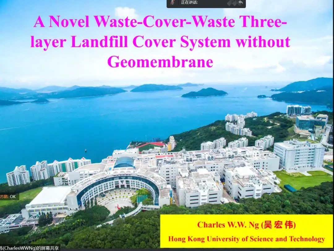 国家杰出青年(海外类)、香港工程科学院院士、英国皇家工程院院士吴宏伟教授介绍了一种无土工膜的新型植被三层垃圾填埋场覆盖系统,现场长期监测结果表明该系统可有效减小降雨渗透。研究对覆盖系统设计提出了详细建议。